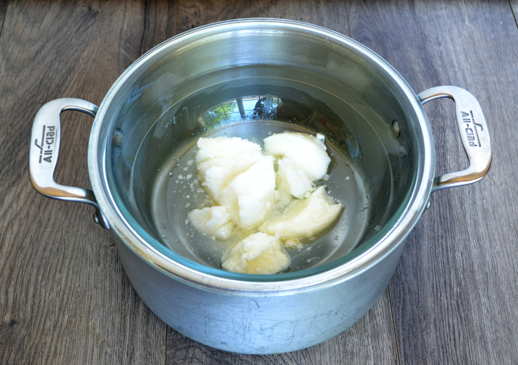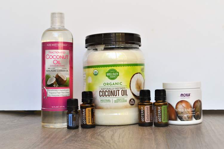 Melt your coconut oil, fractionated coconut oil and shea butter in a double boiler. This should only take about 5 minutes after the water is boiling, so keep an eye on it.