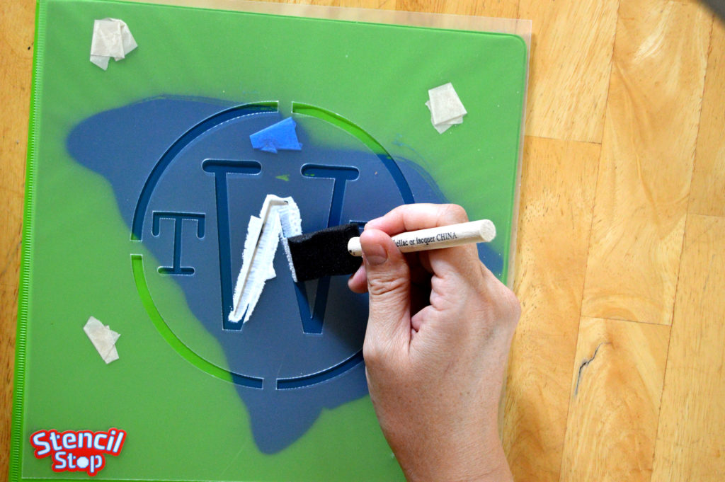 Stencil Stop is a small stencil company offering a variety of collegiate and state stencils. I’m not super interested in sports, but love my state emblem and flag, so I was thrilled to find them in the catalog. What appealed to me the most, however, is the “Design Your Own” stencil option. I quickly designed my own monogram using Adobe Illustrator, saved it as a jpeg and uploaded it to their site. They promptly provided the finished product. Looking back, I probably would have made it smaller, but the quality is great!