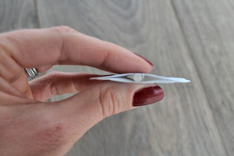 - Next, center a piece of double sided tape to one cut-out and then place a lollipop stick in the middle.