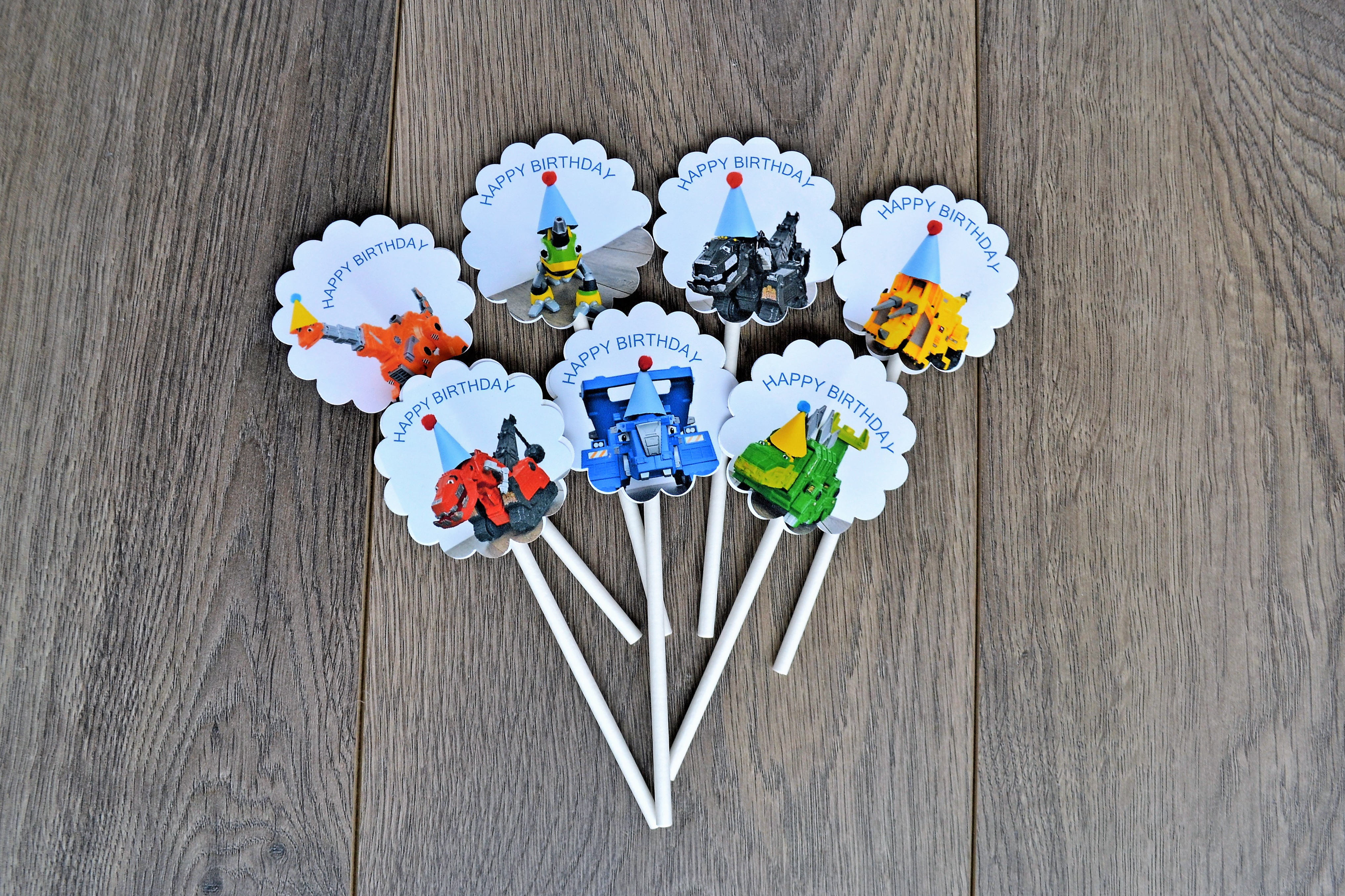 I have a Dinotrux superfan at my house! He watches the show, plays with the toys and even eats yogurt because it has Dinotrux characters printed on the container. Since my son received all of the toy figures for Christmas, it made sense that he wanted his birthday cupcakes to have his favorite guys on top! I LOVE to decorate cupcakes and cakes, so I was excited for this task. While searching online, I determined there are very few options for Dinotrux cupcake toppers. Therefore, this crafty girl got to work! I took my own photos and created cupcake toppers using the toy figures my son already owns. They were fun to make and now YOU can download the file for free!