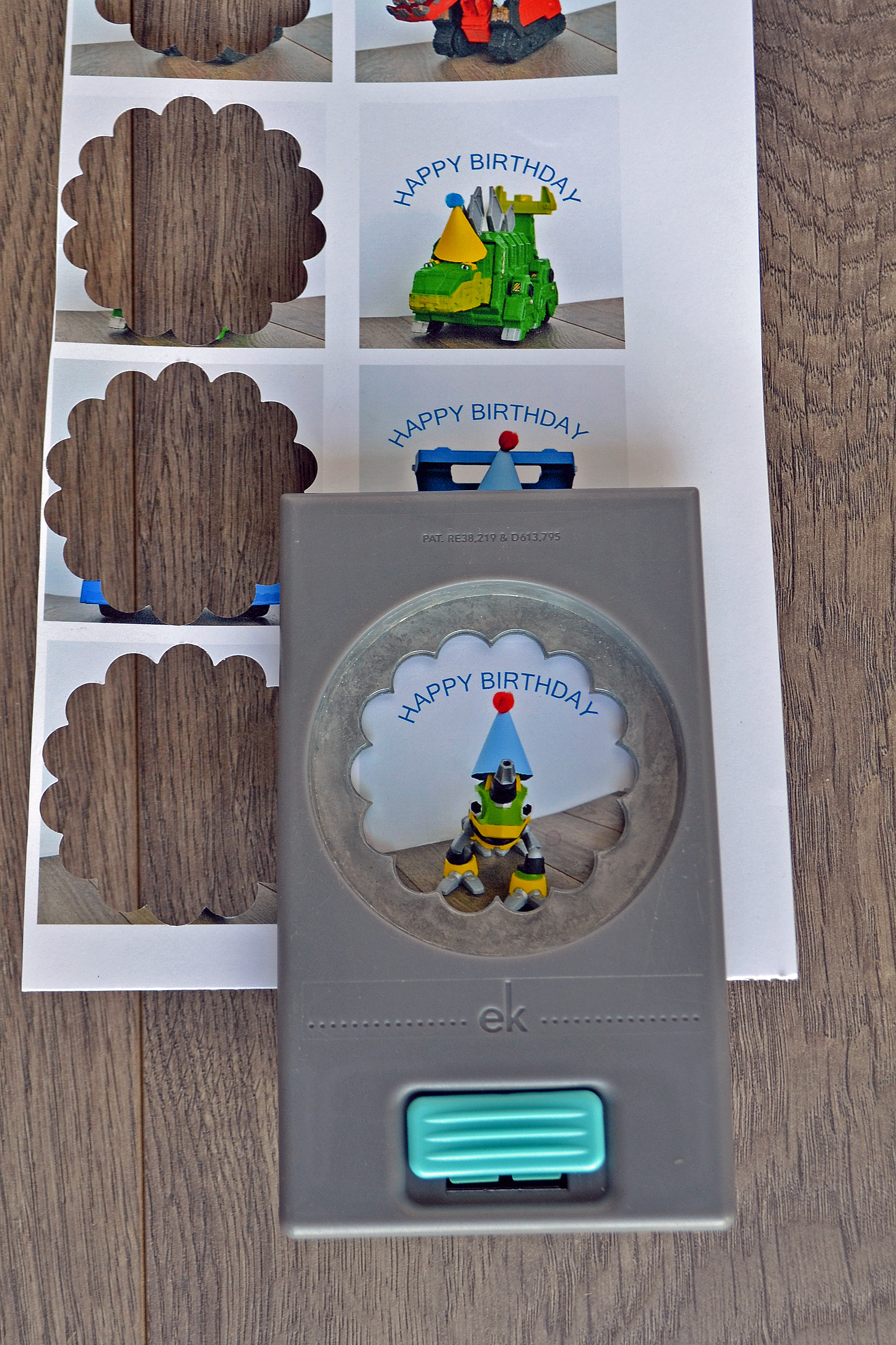 - Use a 2″ hole punch to cut out each Dinotrux character.