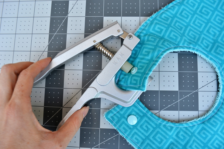 - Install your snaps at the top of the bib. Place them in the center and about 1″ to the end of the neck straps. You can certainly use metal snaps, but I prefer frustration-free plastic KAM snaps. Check out the tutorial here for installation instructions.