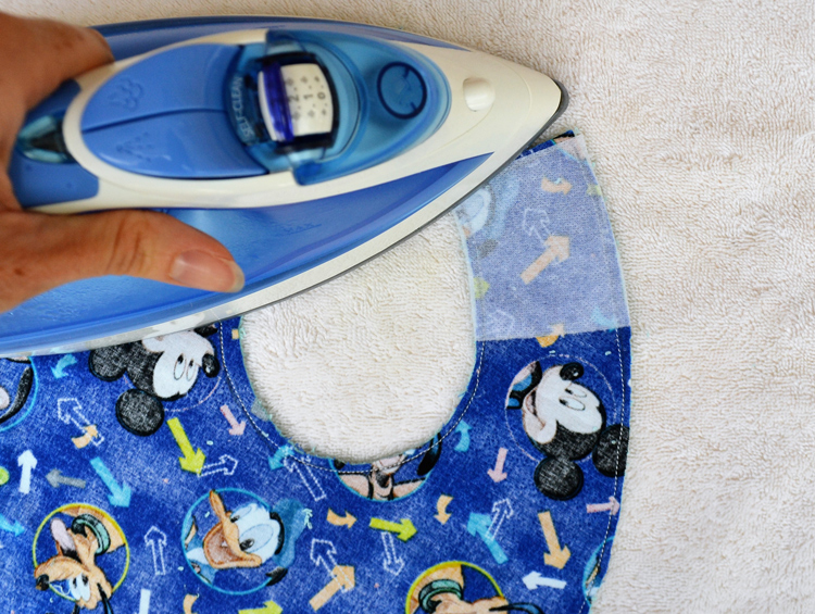 - Cut out squares of fusible interfacing that measure 2″ x 3″. Iron them on the ends of the bibs to reinforce where the snaps will attach.
