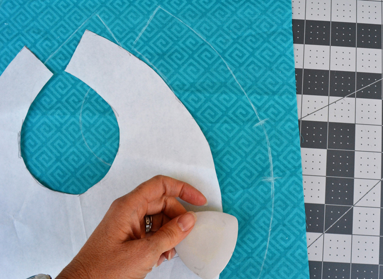 - Trace the pattern on the back side of your cotton fabric using tailors chalk. Make sure to mark the section of your fabric that you will not stitch. This section isn’t sewn together, so you can turn the two pieces right side out.