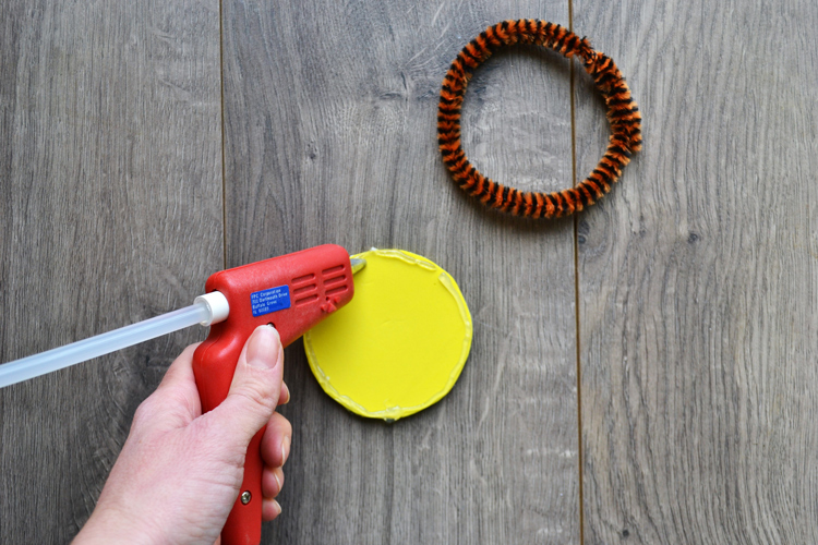 - Take a pipe cleaner and make a circle 1/4″ smaller then the circumference of the foam circle. Using your glue gun, apply glue around the edge of the foam circle and attach the pipe cleaner.