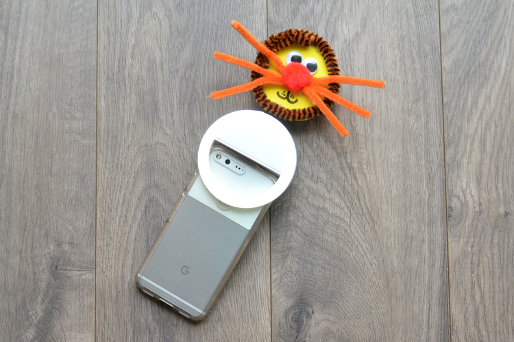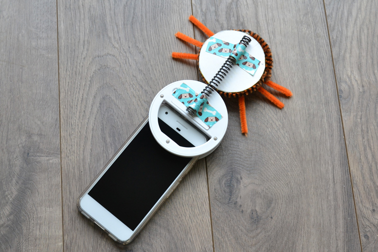 - Attach your critter to the spring with a piece of duck tape. Then fasten the other end of your spring with duck tape to your ring light. When you pull the critter back and then let it pop up, it will land right above the light. This way, your kid will look just above the camera lens.
