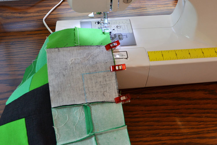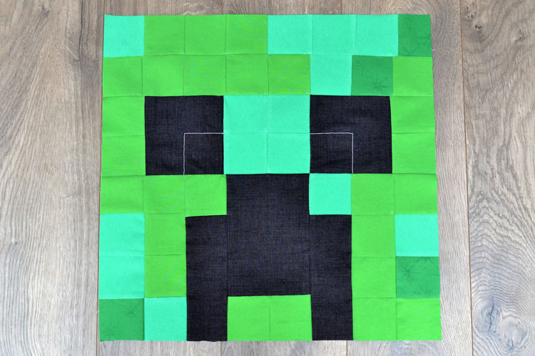 Refer to your printed Minecraft Creeper image and pin together each square of the pillow. Sew all of the squares together using a 1/4″ seam then iron the front panel.
