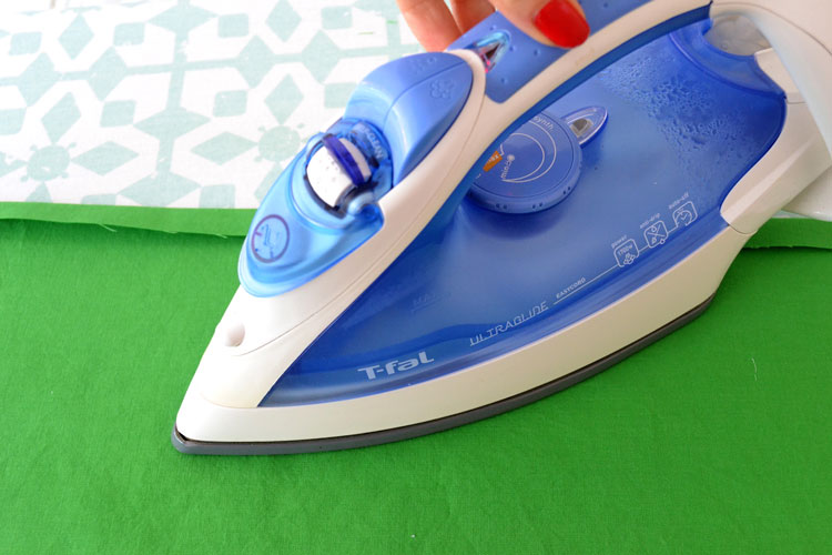 Grab the two back pieces of Kelly Green that both measure 16 1/2″ x 12 1/4″. Take the short side of one back panel and fold it under by 1/2″ and press with an iron. Next, fold it again by another 1/2″ and press a second time. After it is folded twice, pin the length down.