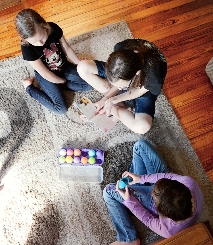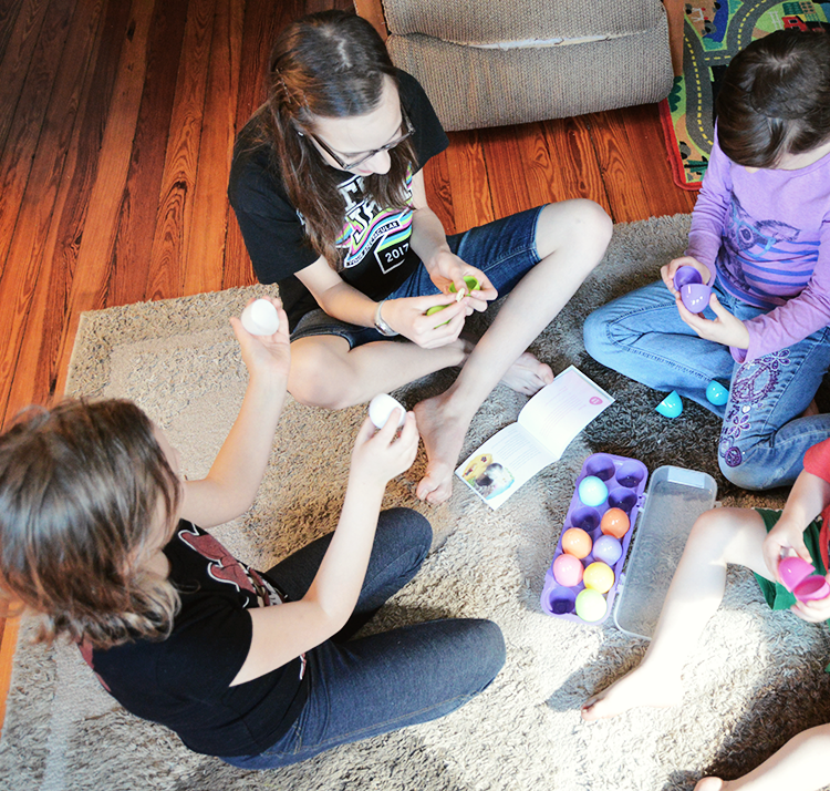 I first encountered the eggs when our oldest daughter was 2 or 3 and attending a kids program at a church. I forgot about them until last week, when the memory burst forth, and then wasted no more time ordering a set (affiliate) from Amazon. Thanks to Prime, they were on my doorstep in 2 days. The kids immediately tore into the box. My oldest – who is now 12 – loved them as much, if not more, than the other 3 younger kids. It’s worth noting that the eggs contain some small pieces, so the little ones definitely need supervision, but I can already tell that they will be a part of our Easter tradition from now on.