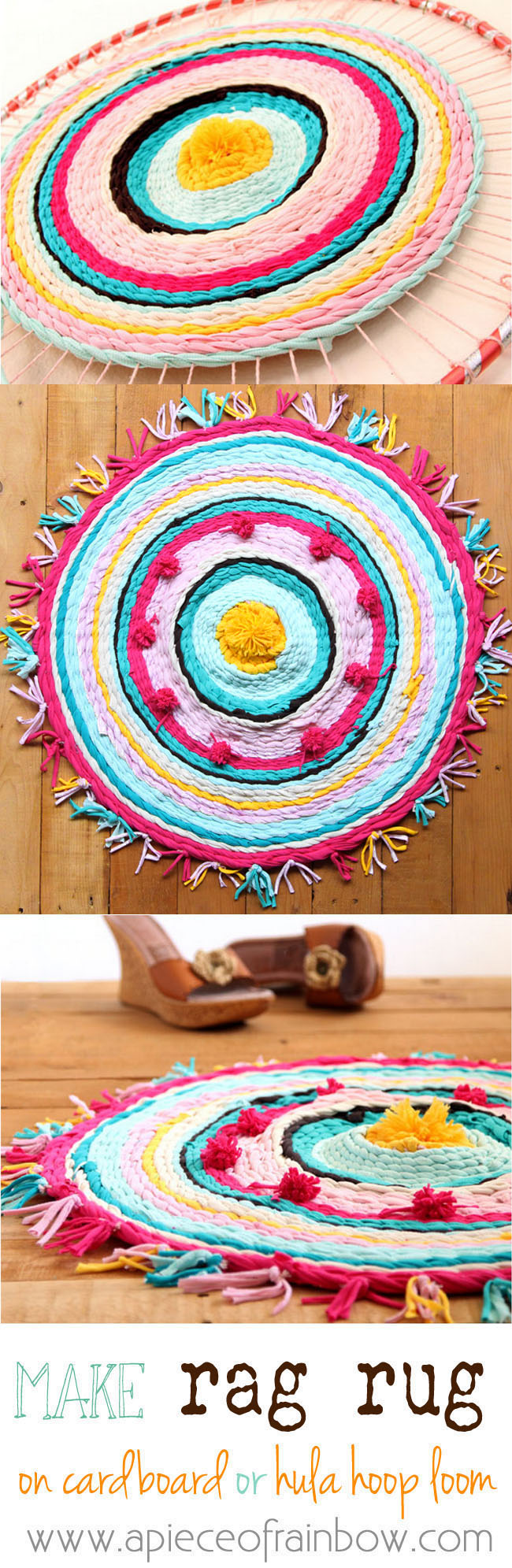 We shared how to make your own continuous t-shirt yarn — now, what do you do with it? This super cute rag rug is a GREAT first project! Can’t you just see this in a kitchen, bathroom or office – anywhere you need a soft surface and splash of color? This tutorial shows you how to make a precious rag rug out of your t-shirt yarn using just some yarn, cardboard and a hula hoop! There are also some great troubleshooting ideas! See more in the post at A Piece of Rainbow.